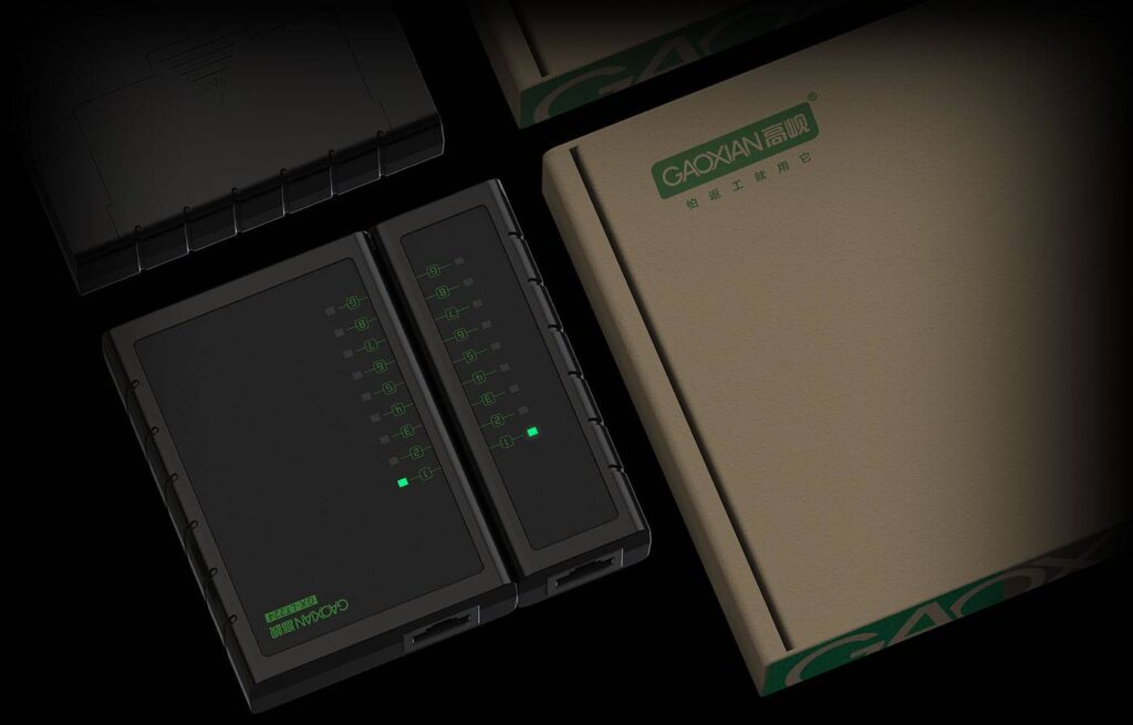 Cable tester for sequencing the hand-made patch cord. The light shows the result, ordered shining means the correct result.