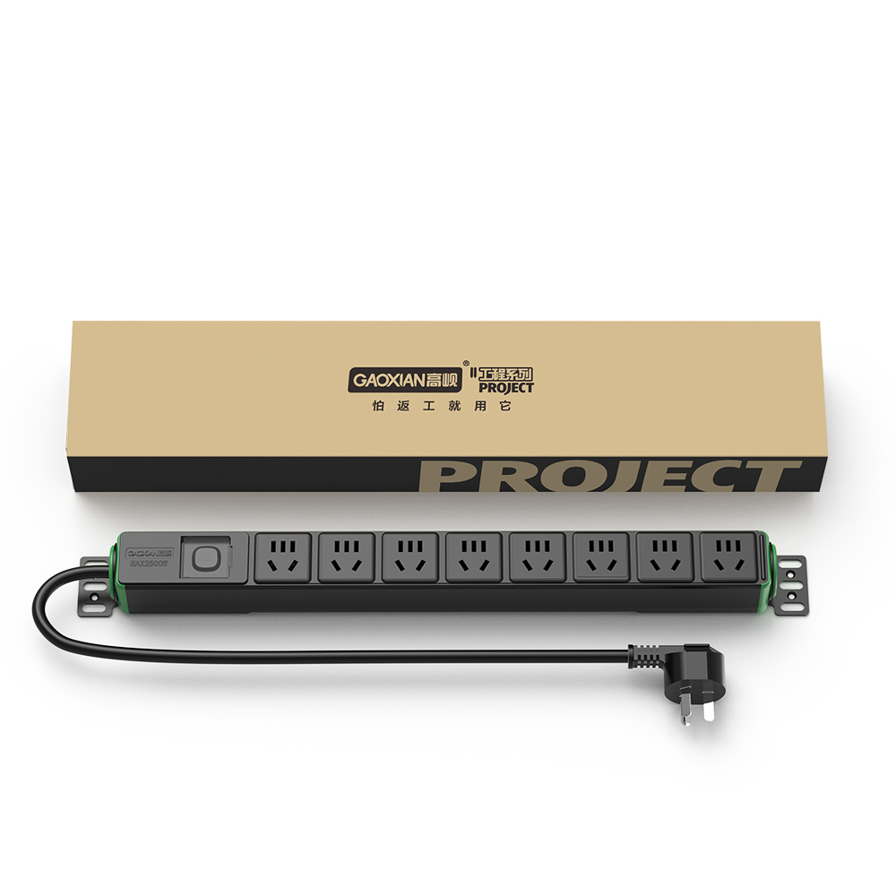 Industrial PDU with built-in copper bars, using an integrated molding process. The conductors are made of the same copper material, with low resistance and low loss. Maximum output power is 2500W, maximum output current is 10A, and rated output voltage is 250V.